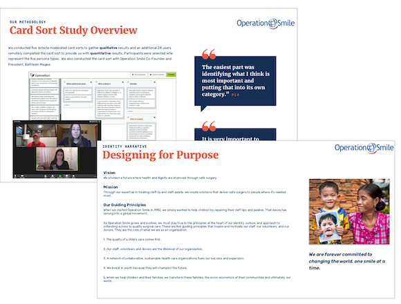 The Solution: To develop this strategy for Operation Smile I led the stakeholders through brand exercises and persona development. I also completed a full content audit of their website. I leveraged this audit to create a Card Sort study to investigate how users see their content. The card sort study had an unmoderated quantitative component as well as a smaller moderated qualitative component. I also designed a quantitative web survey that provided additional insight into how users perceive Operation Smile. Additionally, I completed a comparative analysis of primary navigation and language of other non-profits. All of these inputs were assembled and became the core of the Strategy and Conceptual Model for Operation Smile and will inform their future website work.