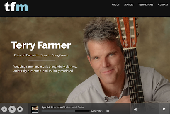 For this project a classical guitarist and songwriter was looking for a clean and elegant website that would allow potential wedding planners to listen to his music samples, read testimonials and contact him. I accomplished this by customizing a Wordpress-based website to organize and allow playback of his music and share in-depth testimonials on any device. I also designed a simple logo for use on the website.